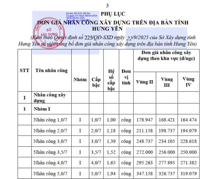 Ngày 22/9/2025, Sở Xây dựng tỉnh Hưng Yên đã ký ban hành Quyết định 225/QĐ-SXD Về việc công bố đơn giá nhân công xây dựng trên địa bàn tỉnh Hưng Yên. Theo đó: