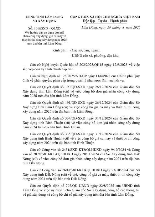 Ngày 29/8/2025, Sở Xây dựng tỉnh Lâm Đồng đã ban hành văn bản số 1018/SXD-QLXD v/v hướng dẫn áp dụng đơn giá nhân công xây dựng; giá ca máy và thiết bị thi công xây dựng năm 2025 trên địa bàn tỉnh Lâm Đồng.