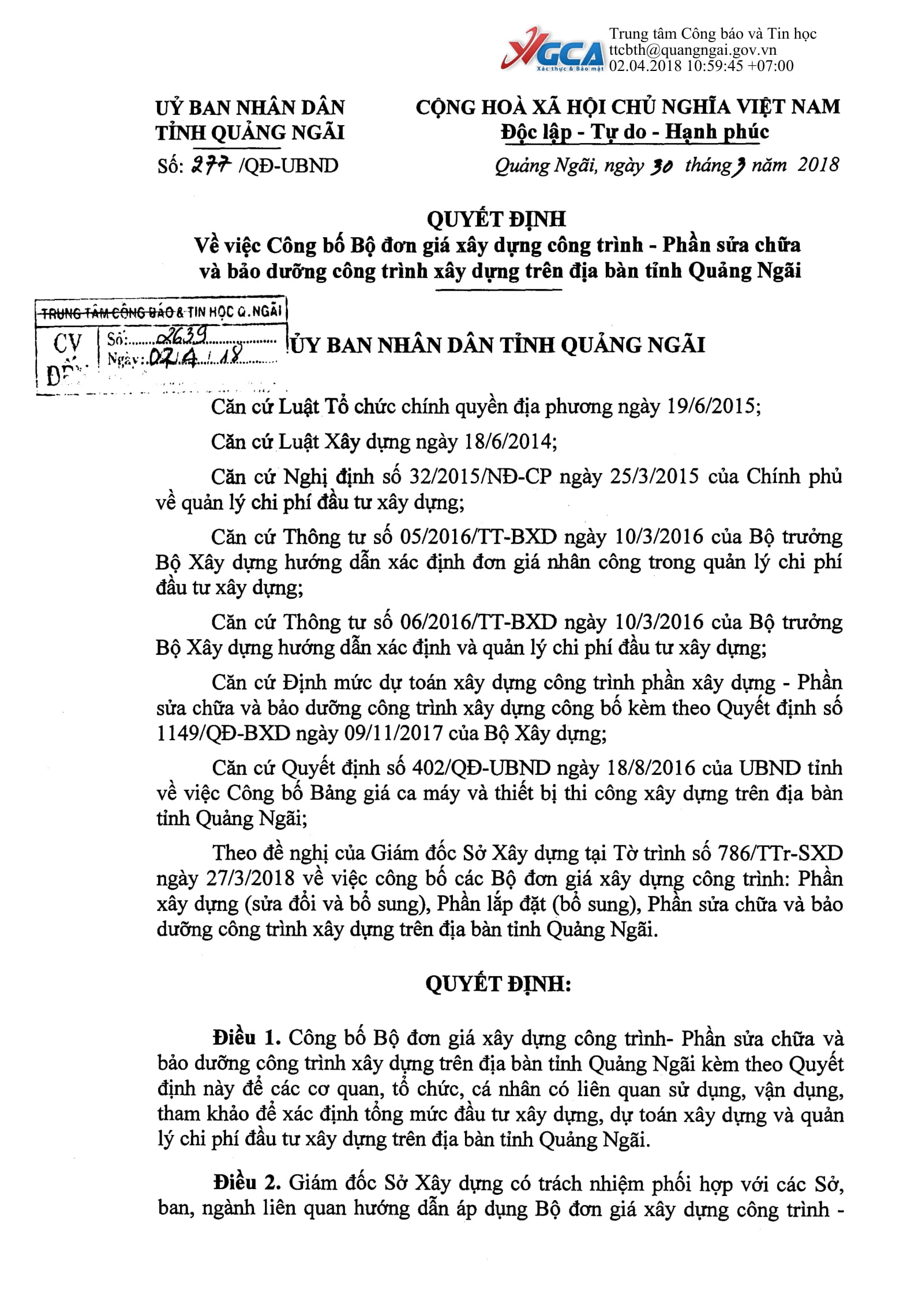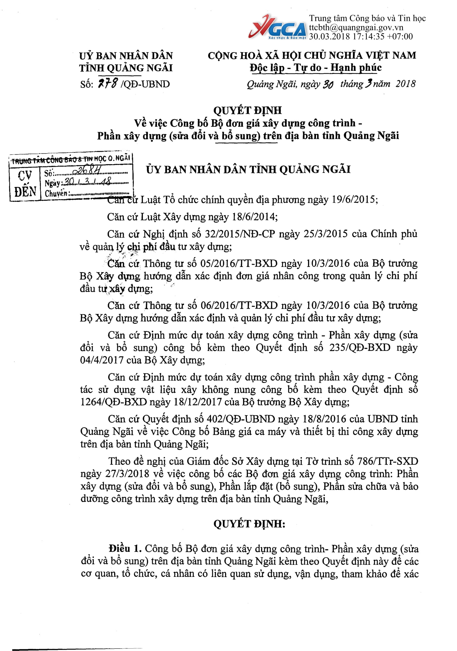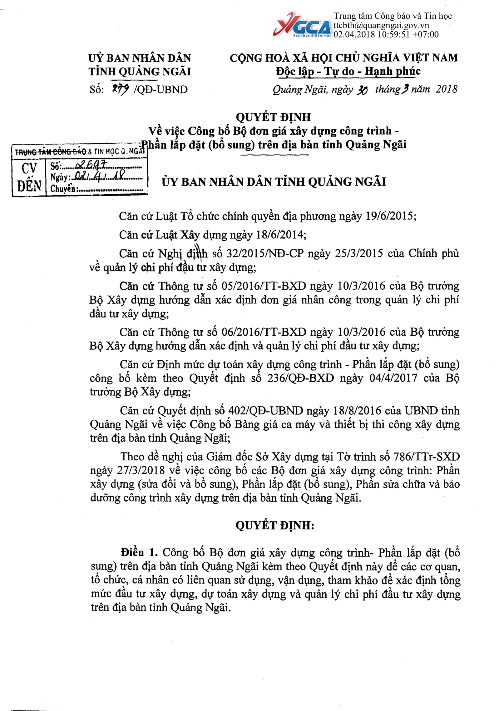 Ngày 30/03/2018, UBND tỉnh Quảng Ngãi đã ban hành Quyết định số 277/QĐ-UBND, 278/QĐ-UBND và 279/QĐ-UBND về việc Công bố bộ đơn giá phần xây dựng công trình trên địa bàn tỉnh Quảng Ngãi: phần sửa chữa, xây dựng (sửa đổi và bổ sung) và lắp đặt (bổ sung).