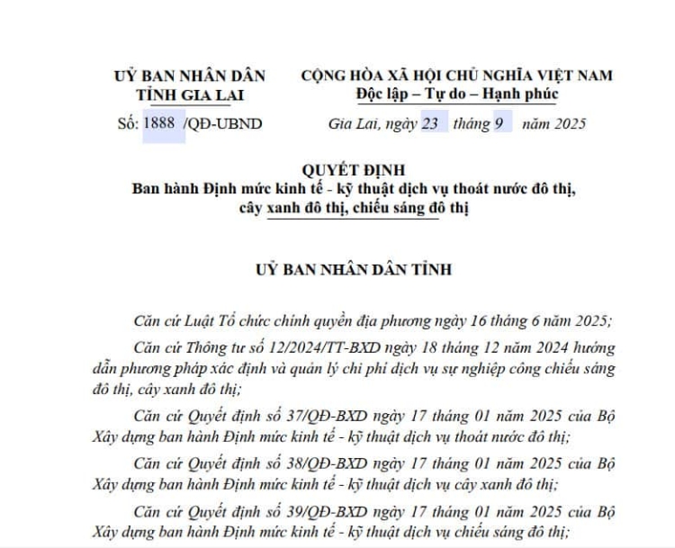 Định mức công ích Gia Lai ngày 23 có thể đề cập đến Quyết định số 1888/QĐ-UBND ngày 23 tháng 9 năm 2025 của UBND tỉnh Gia Lai, ban hành định mức kinh tế - kỹ thuật cho các dịch vụ công ích như thoát nước đô thị, cây xanh đô thị và chiếu sáng đô thị. Tuy nhiên, "định mức 188" có thể là lỗi gõ sai của "1888".