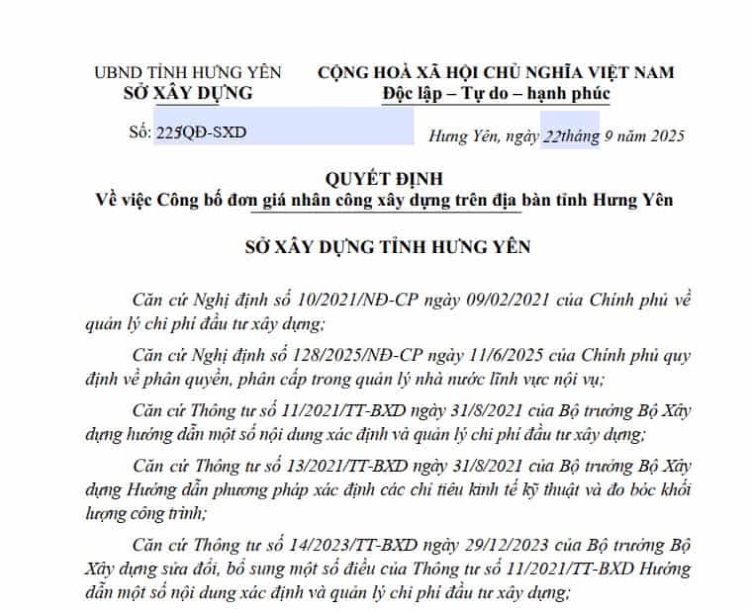 Ngày 22/9/2025, Sở Xây dựng tỉnh Hưng Yên đã ký ban hành Quyết định 225/QĐ-SXD Về việc công bố đơn giá nhân công xây dựng trên địa bàn tỉnh Hưng Yên. Theo đó: